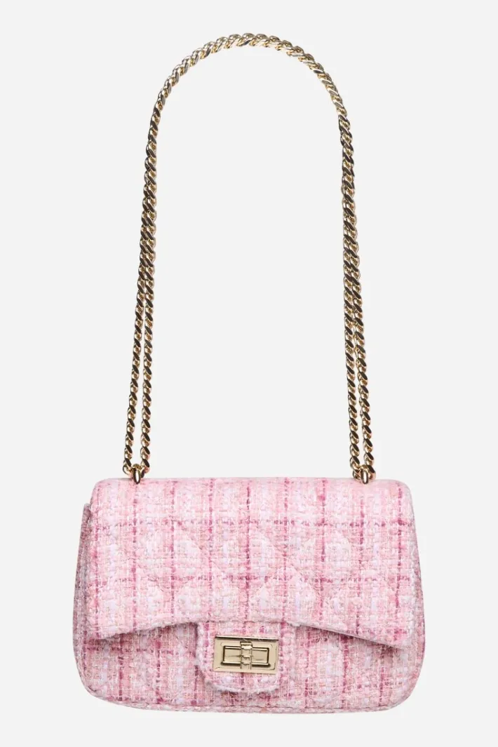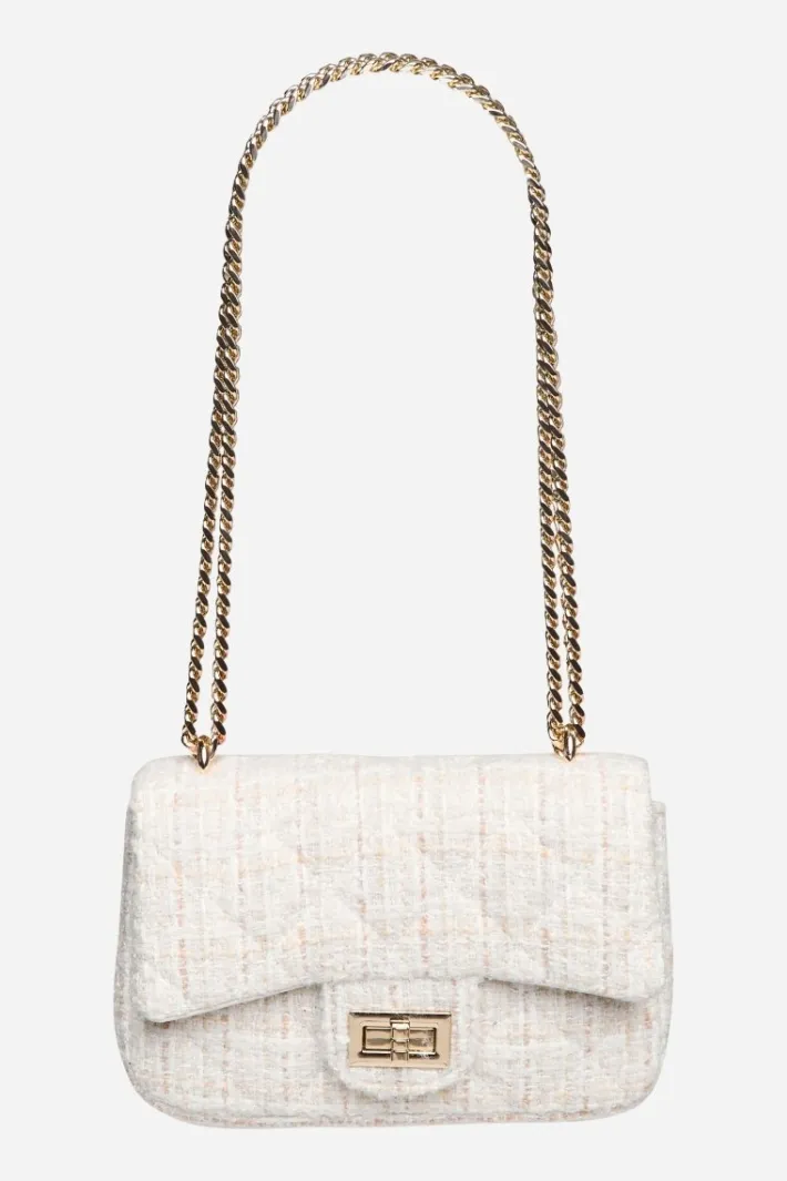 Diese stilvolle Tweed-Bag mit goldenen Kettenriemen und edlem Verschluss ist ein absoluter Hingucker! Das Bouclé-Material verleiht Deinen Outfits eine elegante Note und macht sie perfekt für besondere Anlässe und Abendveranstaltungen.