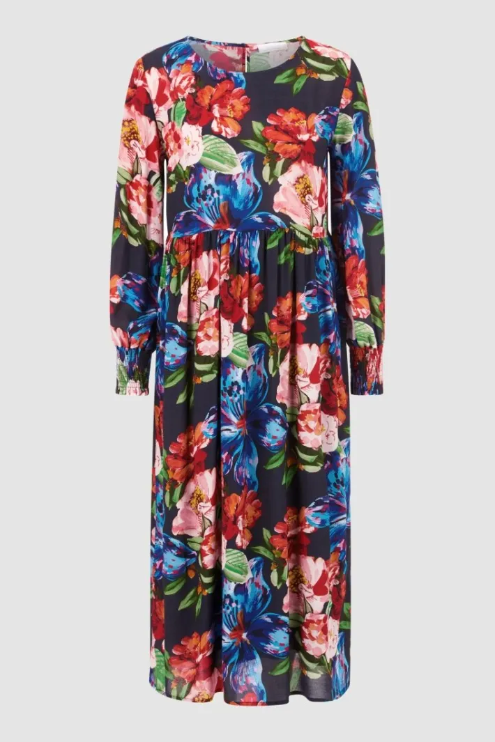 Der Flower-Look dieses Midikleides versprüht romantische Vibes. Dank der soften Viskose erhält der weite Rock ein verspielten Schwung. Schöne Details sind die gesmokten Armmanschetten und der zarte Nackenverschluss. Obermaterial: 100% Viskose Waschbarkeit: Schonwaschgang 30°C