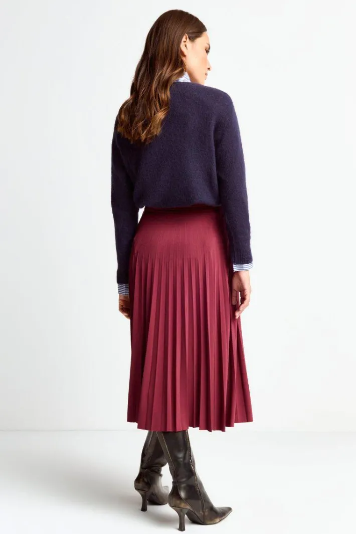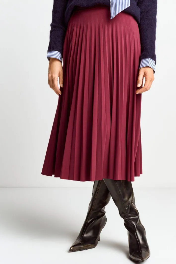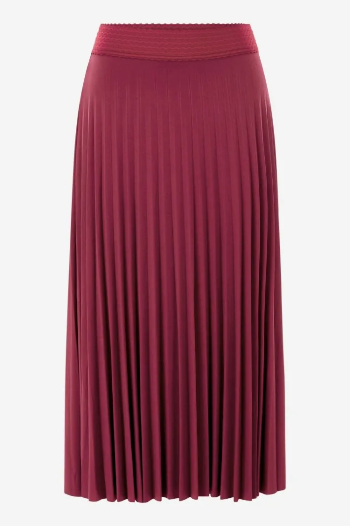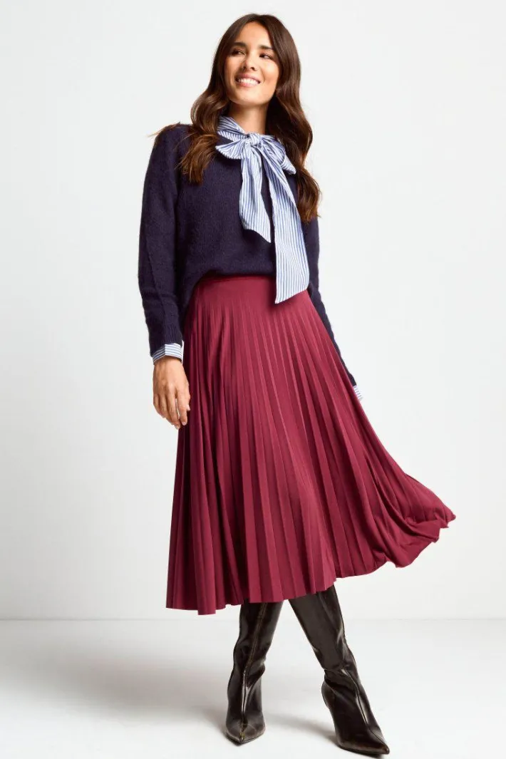 Dieser Midi-Plisseerock in Burgunderrot ist ein Must-have für elegante und herbstliche Outfits! Die fließende A-Linie und der elastische Taillenbund schmeicheln Deiner Figur und sorgen für maximalen Tragekomfort.