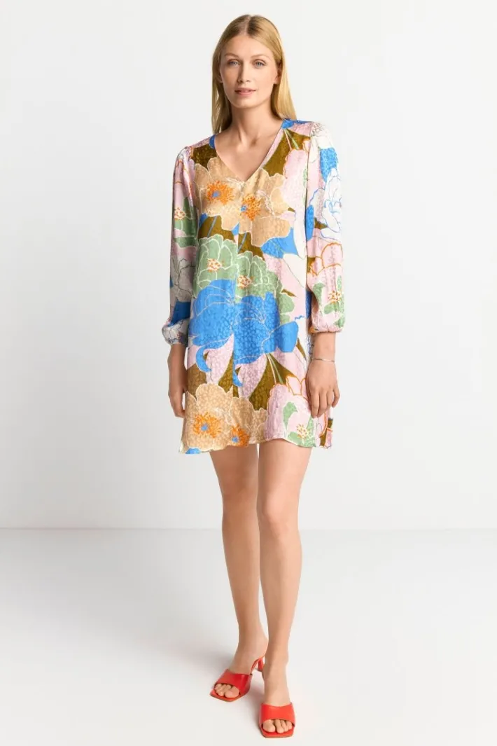 Dieses elegante Blusenkleid wird dank lebendigem Blumenprint in frischen Blau- und Pastelltönen zum vielseitigen Must-have für Deine Garderobe! Die fließende Passform und der feminine V-Ausschnitt sorgen für einen luftigen Tragekomfort.