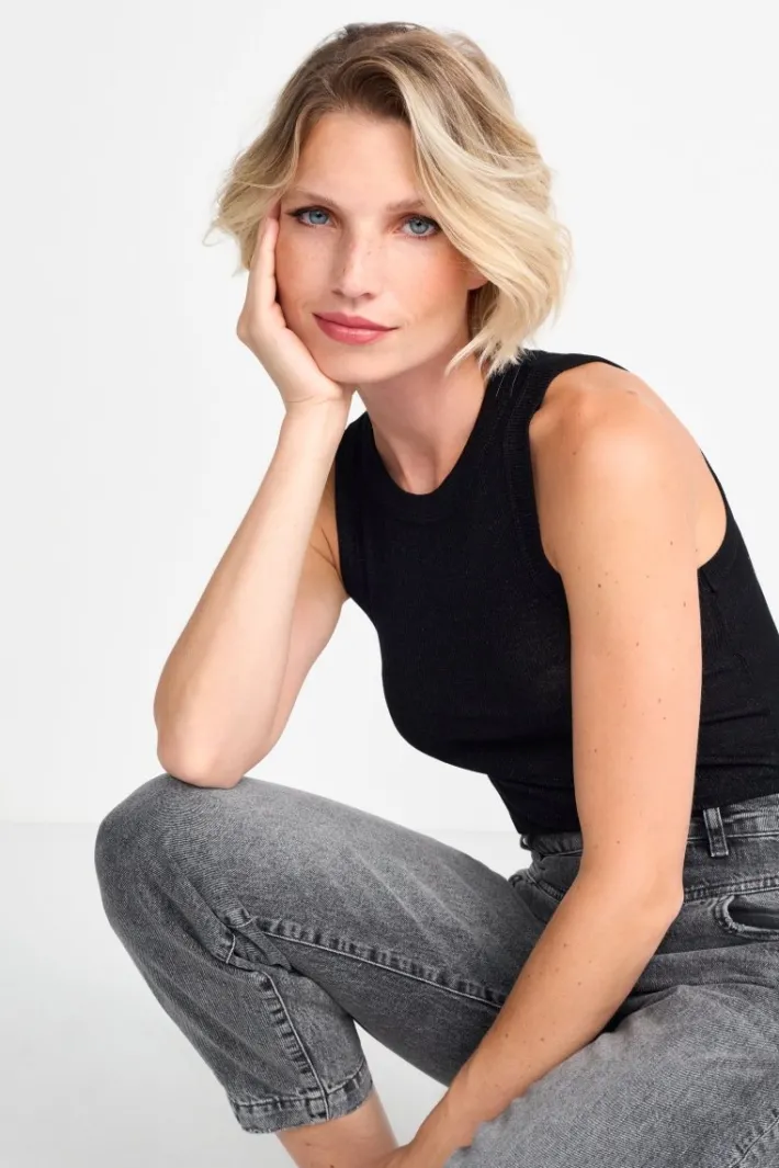 Das schwarze Glam-Top aus Rippstrick ist Dein neuer Allrounder für jeden Anlass! Mit schimmerndem Glitzer und einer figurbetonten Passform zaubert es einen stilvollen Look. Kombiniere es mit Jeanshosen oder Röcken sowie Blazern oder Strickjacken.