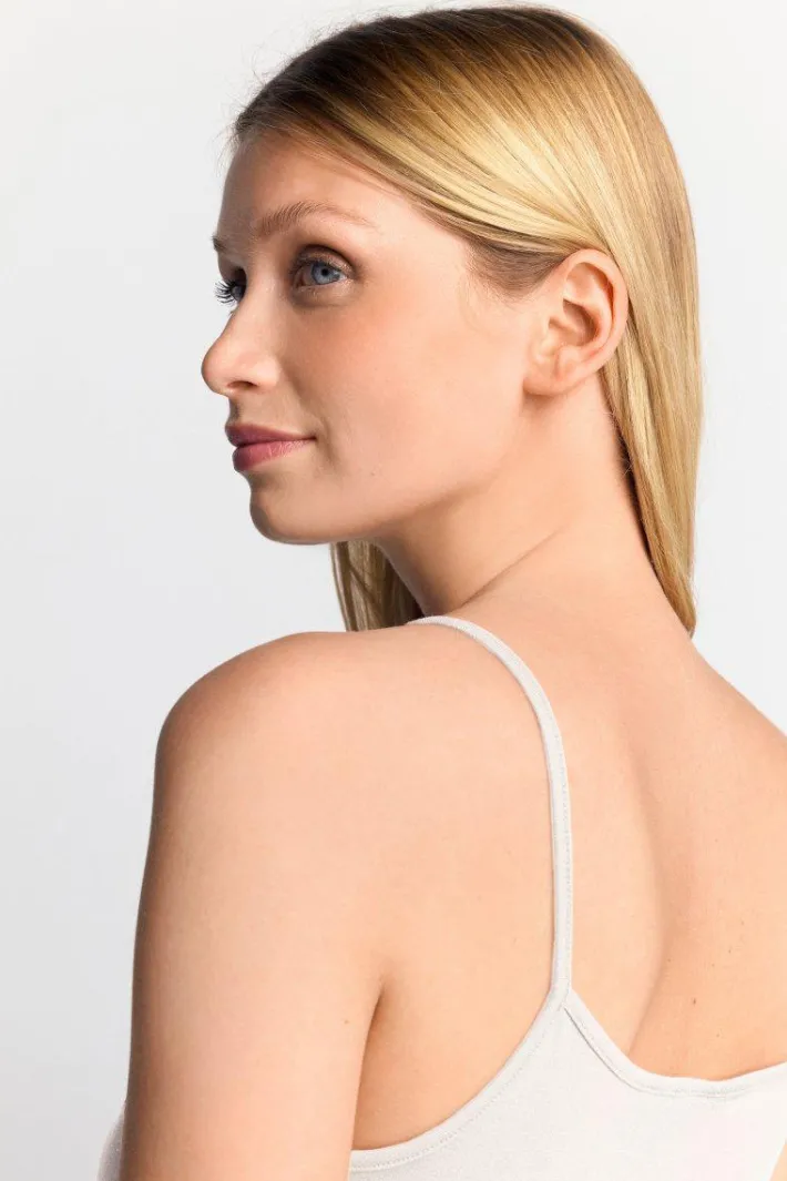 Dieses seidenweiche Spaghettiträger-Top ist ein vielseitiges Trend-Basic! Die hochwertige Fertigung macht es zur perfekten Wahl für sportlich-elegante Sommerlooks sowie in Kombination mit Jacken und Blazern. Obermaterial: 95% Viskose, 5% Elasthan Schonwaschgang 30°C, Nicht bleichen, Nicht im Trockner trocknen, Nicht heiß bügeln, Nicht chemisch reinigen